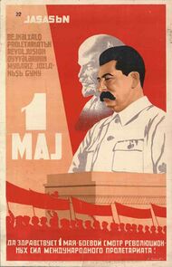 One key element of Soviet propaganda was interactions between Stalin and the children of the Soviet Union. He was often photographed with children of different ethnic backgrounds of the Soviet Union and was often photographed giving gifts to children. In 1935 the phrase, "Thank You, Dear Comrade Stalin, for a Happy Childhood!" started to appear above doorways at nurseries, orphanages, and schools; children also chanted this slogan at festivals.[86] Another key element of Soviet propaganda was imagery of Stalin and Lenin. In many posters, Stalin and Lenin were placed together to show their camaraderie and that their ideals were one. Throughout the 1930s, posters with both images were used as a way to bring the nation and the military together under the policies of the Communist Party during World War II, with the idea of Lenin as the father of the revolutionary ideas and Stalin as the disciple who would fulfill the communist ideals.[81] Stalin was also portrayed in numerous films produced by Mosfilm, which remained a Soviet-led company until the fall of the Soviet Union.