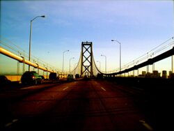 In 1990, Gibson contributed to "Visionary San Francisco", an exhibition at the San Francisco Museum of Modern Art shown from June 14 to August 26.[105] He wrote a short story, "Skinner's Room", set in a decaying San Francisco in which the San Francisco–Oakland Bay Bridge was closed and taken over by the homeless – a setting Gibson then detailed in the Bridge trilogy. The story inspired a contribution to the exhibition by architects Ming Fung and Craig Hodgetts that envisioned a San Francisco in which the rich live in high-tech, solar-powered towers, above the decrepit city and its crumbling bridge.[106] The architects exhibit featured Gibson on a monitor discussing the future and reading from "Skinner's Room".[89] The New York Times hailed the exhibition as "one of the most ambitious, and admirable, efforts to address the realm of architecture and cities that any museum in the country has mounted in the last decade", despite calling Ming and Hodgetts's reaction to Gibson's contribution "a powerful, but sad and not a little cynical, work".[106] A slightly different version of the short story was featured a year later in Omni.[107]