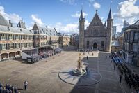 Every third Tuesday in September is Prinsjesdag, or Prince's Day, the opening of the Dutch parliament. On a festive day, children in The Hague are free from school so they may watch the procession of the Golden Coach. The King is driven in the coach from Noordeinde Palace to the Ridderzaal in the Binnenhof. Here, the King reads the Speech from the Throne, written jointly by the Ministers and Secretaries of State. This troonrede outlines the government's plans for the coming year. As the procession returns to the Noordeinde Palace, the road is lined with members of the Dutch Royal Armed Forces, and in the afternoon, the Royal Family appears on the palace balcony to address an adoring and often frenzied public (balkonscène).[56]