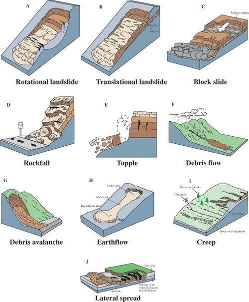 Nevertheless, in broader usage, many of the categories that Varnes excluded are recognised as landslide types, as seen below. This leads to ambiguity in usage of the term.