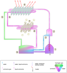 Ammonia is the refrigerant and water the absorption medium.[1] In the absorber and generator, the absorption or effect of the ammonia aqueous solution is used to radiate heat or absorb heat. In the evaporator and condenser, the phase change of pure ammonia is used to complete the external absorption or heat release.[4] Like a traditional heat pump, the refrigerant (ammonia) is condensed in the condenser, and heat is then released; the pressure is dropped after the expansion unit and the refrigerant is evaporated to absorb heat.[citation needed]
