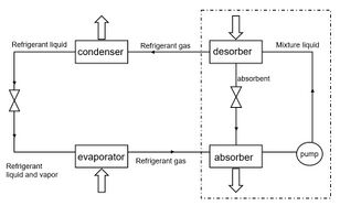 For the absorption heat pump circulation, the absorber, generator and pump can be regarded as a "thermal compressor". The absorber is equivalent to the inlet side of the compressor, and the generator is equivalent to the outlet side of the compressor. The absorbent can be regarded as a carrier liquid that transports the generated refrigerant gas from the low-pressure side of the cycle to the high-pressure side.[5]
