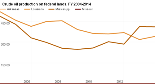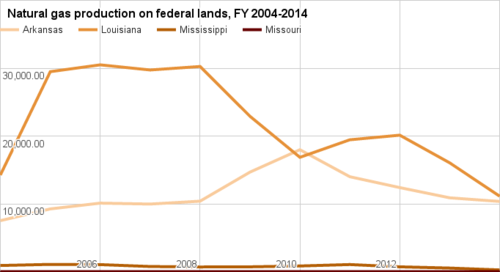The Office of Natural Resources Revenue (ONRR) provides data on mineral production on federal lands. The charts and tables below show federal onshore oil and/or natural gas production (in terms of the amounts sold) for fiscal years 2004 to 2014 for Arkansas, its adjacent states (provided for comparison), and the United States as a whole.[22]