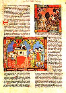 Minium was frequently used in medieval manuscripts. The color was used in particular for the paragraph signs, versals, capitals, and headings.[3](p106) The Latin verb for this kind of work was miniare, to apply minium, and a person who did this was known as a miniator. These medieval artists also made small illustrations and decorative drawings in the manuscripts, which became known as miniatures, the source of the English word for small works of art.[5]