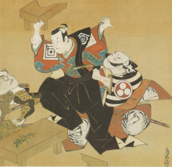 Minium is common on Japanese paintings of the Ukiyo-e school in the seventeenth through nineteenth centuries. The orange color on these works has generally been well preserved because the paintings were mounted on scrolls and subsequently rolled up and protected (as seen in Three Actors Playing a Scene from the Freer Gallery of Art, Washington). Some areas of brown red lead, however, are present in the work.[1](p117)