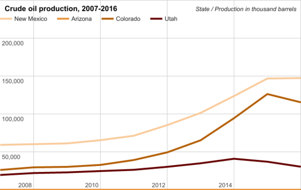 Crude oil production in New Mexico and neighboring states (2007-2016)