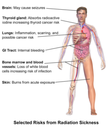 Radionuclides are reactive forms of elements that can be present in drinking water either through man made or natural processes. Every radionuclide has its own half life therefore has its own specific rate of measurement before decaying. There are some radionuclides that decay in seconds while others takes millions of years. Once it decays radionuclides turn into radioisotopes. This process emits radiation. Exposure to radiation to lead to acute and chronic consequences for human health including radiation sickness, cancer, and cardiovascular disease.[60] The EPA has issued standards for alpha particles, beta particles and photon emitters, radium and uranium.[26] There is a combined standard of 4 mrem/year for beta emitters, a gross alpha standard for all alphas of 15 pCi/L, and a combined radium 226/228 of 5 pCi/L. Uranium and radium are given a different standard of 30 µg/L.[61] The regulation of radionuclides began in 1977 and updated in 2000 to ensure that the maximum contaminant levels (MCL) are met according to the Radionuclides Rule in the state and public water systems.