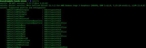 An example of vainfo output, showing supported video codecs for VA-API acceleration