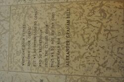 Unsure of his future, he contemplated returning to London to complete his studies, but decided to return to Boston as a teacher.[61] His father helped him set up his private practice by contacting Gardiner Greene Hubbard, the president of the Clarke School for the Deaf for a recommendation. Teaching his father's system, in October 1872, Alexander Bell opened his "School of Vocal Physiology and Mechanics of Speech" in Boston, which attracted a large number of deaf pupils, with his first class numbering 30 students.[62][63] While he was working as a private tutor, one of his pupils was Helen Keller, who came to him as a young child unable to see, hear, or speak. She was later to say that Bell dedicated his life to the penetration of that "inhuman silence which separates and estranges".[64] In 1893, Keller performed the sod-breaking ceremony for the construction of Bell's new Volta Bureau, dedicated to "the increase and diffusion of knowledge relating to the deaf".[65][66]