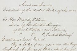 A letter of credence (lettres de créance) is the instrument by which a head of state appoints ("accredits") ambassadors to foreign countries.[2][3] Also known as credentials, the letter closes with a phrase "asking that credit may be given to all that the ambassador may say in the name of his sovereign or government."[2] The credentials are presented personally to the receiving country's head of state or viceroy in a formal ceremony. Letters of credence are worded carefully, as the sending or acceptance of a letter implies diplomatic recognition of the other government.[2] Letters of credence date to the thirteenth century.[4]