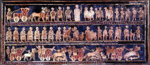 There were at least two postal services during the history of Rome—the cursus publicus and the agentes in rebus.[26] Both were created during the Roman Empire, and both survived its dissolution, at least for a time. The established routes of the cursus publicus are sometimes argued to be outlined in the Tabula Peutingeriana, a surviving illustrated itineraria from the 4th century, although this claim is disputed.[27] Both services existed to deliver messages (including military orders) and to collect taxes. Occasionally they also acted as spies and couriers for the military, collecting intelligence and delivering orders. Couriers relied on stationes (publicly funded way-stations) and mansiones (private residences) for shelter and food, and had the ability to compel private citizens to provide for them.[28]