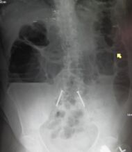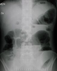 | Upright abdominal X-ray demonstrating a small bowel obstruction. Note multiple air fluid levels. | |