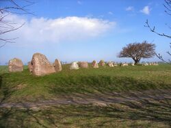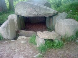 Megaliths in Mecklenburg-Vorpommern are the subject of an abundance of lore, dealing primarily with giants, fairies, dwarfs, subterraneans and hidden treasures.[19] The giant tales relate primarily to the megaliths' creation, which was assumed to be the result of stones lost or thrown by giants, or of giants building houses, ovens or tombs.[19] Thus, the population refers to dolmens as Hünengräber ("giants' tombs", Sg. Hünengrab).[19][20]