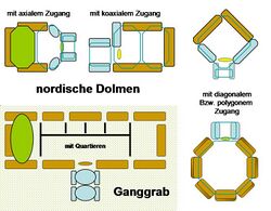 The type of megalithic structures varies between different, overlapping regions.[1] Schuldt classified those regions as follows: He found long mounds without chambers in the southwestern part of Mecklenburg, passage graves in the northern and central part of Mecklenburg, extended dolmens in southern Mecklenburg, great dolmens with 'draught excluders' (Windfang) in northern Vorpommern, great dolmens with ante-chambers (Vorraum) in central Vorpommern, and stone cists in southern Vorpommern and eastern Mecklenburg.[1][9]