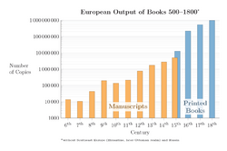 Printing brought profound social changes. The rise in literacy across Europe led to a dramatic increase in the demand for reading matter.[16] Prices of reprints were low, so publications could be bought by poorer people, creating a mass audience.[19] In German language markets before the advent of copyright, technical materials, like popular fiction, were inexpensive and widely available; it has been suggested this contributed to Germany's industrial and economic success.[19] After copyright law became established (in 1710 in England and Scotland, and in the 1840s in German-speaking areas) the low-price mass market vanished, and fewer, more expensive editions were published; distribution of scientific and technical information was greatly reduced.[19][20]