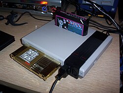 Generation NEX is a Nintendo hardware clone released in 2005.[20][21] It is compatible with Japanese Famicom and North American/European NES cartridges. A front-loading slot is used for NES games, like the original console, while a top-loading slot handles Famicom games.[22] Messiah Entertainment Inc., a company based in Los Angeles,[23] announced the Generation NEX in May 2005.[24] The console was shown at the Classic Gaming Expo that August, and was scheduled for release in September 2005.[25][26][27] The NEX is a slimmer version of the original NES, measuring an inch and a half in height.[22] The console uses a custom-designed integrated circuit based on NES-on-a-chip, which is used by most Nintendo clone consoles.[28] The NEX is compatible with approximately 95 percent of NES games,[29] excluding games such as Castlevania III.[20][22] The console includes stereo sound capabilities for homebrew games.[20]