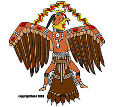 A digital illustration of a Southeastern Ceremonial Complex Falcon Dancer by the artist Herb Roe, based on a whelk shell engraving from Spiro, Oklahoma.