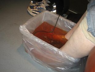 Detoxification foot baths consist of two major components, a simple container in which to place the feet and an electrode array. Usually a fragrant, warm salted water is used as the electrolyte and the customer's feet, along with the array are immersed in this water. Inside the array are two metal electrodes, between which a current flows, causing the electrodes to rust rapidly due to electrolysis.[4] This reaction quickly turns the salt water solution brown, and flakes of rust may also be visible in the water.[5] Electrode arrays used in this application degrade quickly, and usually need to be replaced after roughly 16 hours of use.[3]