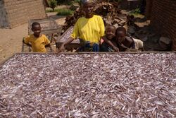 In Lake Kariba 360,000[11] Lake Tanganyika sardines were introduced by the Zambian government[12] in 1967 and 1968 to be fished, here they enter the fishery at about 40 millimetres (1.6 in) in length when they are 3–4 months old. The bulk of those caught in the fishery are 40–50 millimetres (1.6–2.0 in) long and about 5 months old. There appears to be a correlation between biomass and fishing effort, as the biomass was 10% lower in 1985 than it was in 1974 when fishing began.[6] The annual catch on Lake Kariba is now between 20,000 and 30,000 tonnes (22,000 and 33,000 short tons).[12]