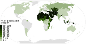 While there are several Islamic schools and branches, the two largest denominations are Sunni Islam (75–90% of all Muslims)[53] and Shia Islam (10–20% of all Muslims).[19][20][21] By sheer numbers, South Asia accounts for the largest portion (31%) of the global Muslim population.[54][55] By country, Indonesia is the largest in the Muslim world, holding around 12% of all Muslims worldwide;[56][57] outside of the Muslim-majority countries, India and China are home to the largest (11%) and second-largest (2%) Muslim populations, respectively.[58][59][60] Due to high Muslim population growth, Islam is the fastest-growing religion in the world.[61][62][63]