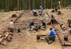 This describes the use in excavations of various types and sizes of machines from small backhoes to heavy duty earth-moving machinery. Machines are often used in what is called salvage or rescue archaeology in developer-led excavation when there are financial or time pressures.[4] Using a mechanical excavator is the quickest method to remove soil and debris and to prepare the surface for excavation by hand, taking care to avoid damaging archaeological deposits by accident or to make it difficult to identify later precisely where finds were located.[5] The use of such machinery is often routine (as it is for instance with the British archaeological television series Time Team)[6] but can also be controversial as it can result in less discrimination in how the archaeological sequence on a site is recorded. One of the earliest uses of earth-moving machinery was at Durrington Walls in 1967. An old road through the henge was to be straightened and improved and was going to cause considerable damage to the archaeology. Rosemary Hill describes how Geoffrey Wainwright "oversaw large, high-speed excavations, taking bulldozers to the site in a manner that shocked some of his colleagues but yielded valuable if tantalising information about what Durrington had looked like and how it might have been used."[7] Machines are used primarily to remove modern overburden and for the control of spoil. In British archaeology mechanical diggers are sometimes nicknamed "big yellow trowels".