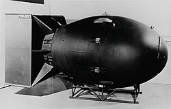 Nuclear weapons have only twice been used in warfare, both times by the United States against Japan at the end of World War II. On August 6, 1945, the United States Army Air Forces (USAAF) detonated a uranium gun-type fission bomb nicknamed "Little Boy" over the Japanese city of Hiroshima; three days later, on August 9, the USAAF[9] detonated a plutonium implosion-type fission bomb nicknamed "Fat Man" over the Japanese city of Nagasaki. These bombings caused injuries that resulted in the deaths of approximately 200,000 civilians and military personnel.[10] The ethics of these bombings and their role in Japan's surrender are to this day, still subjects of debate.
