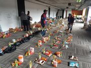 Volunteers in Cape Town pack food parcels to distribute to the needy during the pandemic lockdown in South Africa.