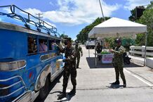 At a community quarantine checkpoint in Bohol, Philippines, police officers check a passing jeepney.