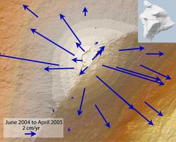 In volcanology, deformation is any change in the shape of a volcano or the land surrounding it. This can be in the form of inflation, which is a response to pressurization, or deflation, which is a response to depressurization. Inflation is represented by swelling of the ground surface, a volcanic edifice, or a subsurface magma body. It can be caused by magma accumulation, exsolution of volatiles, geothermal processes, heating, and tectonic compression. Deflation is represented by shrinking of the ground surface, a volcanic edifice, or a subsurface magma body. It can be caused by magma withdrawal (related to intrusion or eruption), volatile escape, thermal contraction, phase changes during crystallization, and tectonic extension.[1] Deformation is a key indicator of pre-eruptive unrest at many active volcanoes.[2] The term bradyseism is used in the volcanological literature to mean the vertical ground movements associated with the Phlegraean Fields volcanic area west of Naples, Italy.[3]