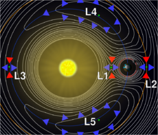 A contour plot of the effective potential due to gravity and the centrifugal force of a two-body system in a rotating frame of reference. (In the context of this article the two bodies are the Sun—the yellow body—and Earth—the dark body between L1 and L2. The Counter-Earth would exist at L3.) The arrows indicate the gradients of the potential around the five Lagrange points—downhill toward them (red) or away from them (blue). Counterintuitively, the L4 and L5 points are the high points of the potential. At the points themselves these forces are balanced.