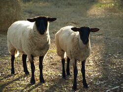 Sheep are flock animals and strongly gregarious; much sheep behavior can be understood on the basis of these tendencies. The dominance hierarchy of sheep and their natural inclination to follow a leader to new pastures were the pivotal factors in sheep being one of the first domesticated livestock species.[58] Furthermore, in contrast to the red deer and gazelle (two other ungulates of primary importance to meat production in prehistoric times), sheep do not defend territories although they do form home ranges.[59] All sheep have a tendency to congregate close to other members of a flock, although this behavior varies with breed,[30] and sheep can become stressed when separated from their flock members.[24] During flocking, sheep have a strong tendency to follow, and a leader may simply be the first individual to move. Relationships in flocks tend to be closest among related sheep: in mixed-breed flocks, subgroups of the same breed tend to form, and a ewe and her direct descendants often move as a unit within large flocks.[23] Sheep can become hefted to one particular local pasture (heft) so they do not roam freely in unfenced landscapes. Lambs learn the heft from ewes and if whole flocks are culled it must be retaught to the replacement animals.[24][60]