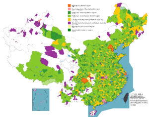 According to the administrative divisions of the China , including Hong Kong and Macau. there are three levels of cities: provincial-level cities[1] (consisting of municipalities Template:Fv span[2]), prefecture-level cities, and county-level cities. As of January 2024, the PRC has a total of 707 cities: 4 municipalities, 2 SARs, 293 prefectural-level cities (including the 15 sub-provincial cities) and 408 county-level cities (including the 38 sub-prefectural cities and 12 XXPC cities). This list does not include any cities in the disputed Taiwan Province and portions of Fujian Province, which are claimed by the PRC under the One China Policy, as these areas are controlled by the Republic of China (see the List of cities in Taiwan).