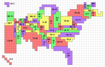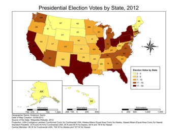 The United States Electoral College is an example of a system in which an executive president is indirectly elected,[1] with electors representing the 50 states and the District of Columbia. The votes of the public determine electors, who formally choose the president through the electoral college. Each state has a number of electors equal to its Congressional representation (in both houses), with the non-state District of Columbia receiving the number it would have if it were a state, but in no case more than that of the least populous state.[2] Under this system, all electors generally cast their votes for the winner of the popular vote in their respective states, except in Maine and Nebraska, where some electors cast votes for the winner of the state popular vote, and some cast their votes for the winner of the popular vote in Congressional Districts.[3] However, there are several states where this is not required by law. In the United States , 270 electoral votes of the 538 electors are currently required to win the presidential election.[4] If no candidate receives the required 270 electoral votes, the lower chamber of the United States' Congress, the House of Representatives, chooses the President, with each state delegation receiving one vote in this election by the Legislature. The Senate chooses the Vice President.[5]