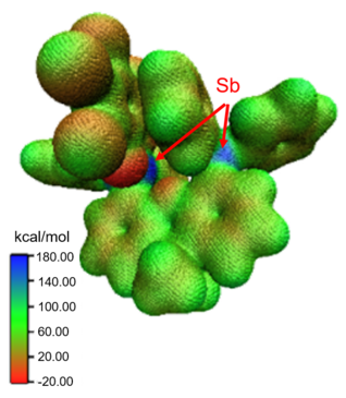 Partial positive charges on the surface of antimony compounds interact with partial negative charges. For example, Sb(C6F5)3(o-O2C6Cl4) has a more positively charged site than Sb(C6F5)3 as shown in its electrostatic potential map, corresponding to higher Lewis acidity (the FIA of Sb(C6F5)3(o-O2C6Cl4) and Sb(C6F5)3 are 116 and 89 kcal/mol, respectively).[7]