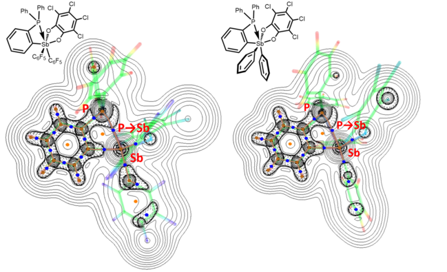 Introduction of electron-withdrawing substituents on antimony results in increased acidity. For example, intramolecular donor–acceptor interactions of two stiboranes, o-C6H4(PPh2)[SbPh2(O2C6Cl4)] and o-C6H4(PPh2)[Sb(C6F5)2(O2C6Cl4)], have been analyzed by AIM. AIM analysis of electron density at the bond critical point (bcp) and delocalization index indicates that electron-withdrawing substituents on Sb(V) lead to an increased P–Sb bonding covalency.[17]