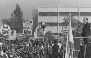 On October 25, 1960, then vice presidential nominee Lyndon B. Johnson visited the campus accompanied by Governor Pat Brown to hold a rally in front of approximately 3,500 students.[13] While some attending students were holding banners in support of his opponents, Johnson used the opportunity to criticize the opposing Republican Party and their candidate Richard Nixon.[13] Four years later, then Republican candidate Nelson Rockefeller held a rally at the university in front of around 6,000 students, which was organized by the university's Republican Club.[13] Having just won the primary in Oregon,[13] California would be crucial in deciding the Republican nominee for the 1964 presidential election. Rockefeller held the lead coming into California but nonetheless lost its primary to Barry Goldwater, effectively handing him the Republican nomination.[16] In December 1965, with increasing conversation and tension on the topic of civil rights in the country, the university hosted a debate on the subject between conservative author and commentator William F. Buckley Jr. and liberal African American journalist Louis Lomax.[13]