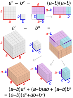 It follows that for any two expressions E and F, one has: [math]\displaystyle{ E^n-F^n = (E-F) \prod_{k=1}^{n-1} \left(E-F e^{2ik\pi/n}\right) }[/math] [math]\displaystyle{ E^n + F^n = \prod_{k=0}^{n-1} \left(E-F e^{(2k+1)i\pi/n}\right) \qquad \text{if } n \text{ is even} }[/math] [math]\displaystyle{ E^{n}+F^{n}=(E+F) \prod_{k=1}^{n-1}\left(E+F e^{2ik\pi/n}\right) \qquad \text{if } n \text{ is odd} }[/math]