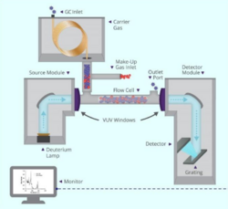 VUV detectors are compatible with most gas chromatography (GC) manufacturers. The detectors can be connected through a heated transfer line inserted through a punch-out in the GC oven casing. A makeup flow of carrier gas is introduced at the end of the transfer line. Analytes arrive in the flow cell and are exposed to VUV light from a deuterium lamp. Specially coated reflective optics paired with a back-thinned charged coupled device (CCD) enable the collection of high quality VUV absorption data. Figure 1 shows a schematic of the analyte path from GC to VUV detector.