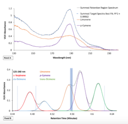 Flow rate-enhanced chromatographic compression utilizes VUV spectral deconvolution to resolve any co-elution that may result from shortening GC runtimes. VUV absorption is additive, meaning that overlapping peaks give a spectrum that corresponds to the sum absorbance of each compound. The individual contribution of each analyte can be determined if the VUV spectra for co-eluting compounds are stored in the VUV library.[10] The ability to differentiate coeluting analyte spectra and use them to deconvolve the overlapping signals is demonstrated in Figure 4. The individual spectra of terpenes limonene and p-Cymene are shown in Panel A along with the summed absorbance of the selected retention time window (blue region in Panel B) and the fit with VUV library spectra. The R2 >0.999 fit result confirms their identities, and enables the deconvolution of these and other terpenes analyzed by GC-VUV as featured in Panel B.