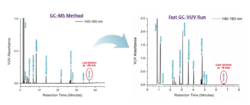 Unique VUV absorbance spectra not only enable unambiguous compound identification, and allows GC run times to be deliberately shortened. VUV detectors operate at ambient pressure and are thus not flow rate limited. GC run times can be reduced by increasing the GC column flow and oven temperature program rates.