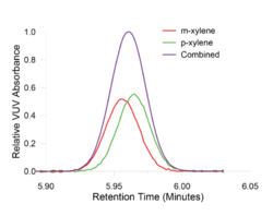 Naphthols, xylenes, and cis- and trans- fatty acids are compounds that are prohibitively difficult to distinguish according to their electron ionization mass spectral profiles.[6] Xylenes present the additional challenge of natural co-elution that makes separating their isoforms problematic. Figure 2 shows the distinct VUV spectra of m-, p-, and o-xylene. These compounds can be differentiated despite their only difference being the position of two methyl groups around a benzene ring. The spectral differences of these isomers enable their co-elution to be resolved through spectral deconvolution.