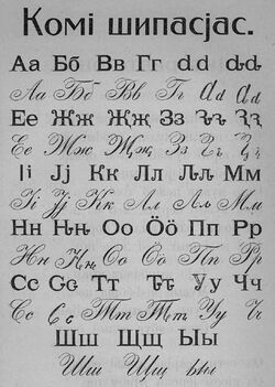 The Molodtsov alphabet (Template:Lang-kv, Molodcov anbur) was based on the Cyrillic alphabet, but had a number of specific letters to indicate soft consonants and affricates. It was used to write both the Komi-Zyrian and Komi-Permyak versions of the language, but active publishing of printed materials using the alphabet did not begin until 1921 due to the lack of necessary typefaces; until then, a modified Russian alphabet was used, compiled by A. A. Zember.[9]