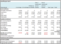 - Assessment of the likehood of funding deficiencies or cost increase across time periods. In case for example, position on the wholesale funding, providers often require liquid assets as collateral. If that collaterals become less liquid or difficult to evaluate, wholesale funds providers may arbitrate no more funding extension maturity