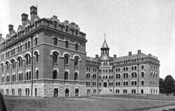 The first building, Main Building, later known as Kirkland Hall, was designed by William Crawford Smith; its construction began in 1874.[27][28] In the fall of 1875, about 200 students enrolled at Vanderbilt, and in October the university was dedicated.[19] Bishop McTyeire was named chairman of the Board of Trust for life by Vanderbilt as a stipulation of his endowment.[19] McTyeire named Landon Garland (1810–1895), his mentor from Randolph-Macon College, as chancellor. Garland shaped the school's structure and hired the school's faculty.[24] Most of this faculty left after disputes with Bishop McTyeire, including over pay rates.[19] When the first fraternity chapter, Phi Delta Theta, was established on campus in 1876, it was shut down by the faculty, only to be reestablished as a secret society in 1877.[29] Meanwhile, Old Gym, designed by Peter J. Williamson, was built in 1879–1880.[28] By 1883, the Board of Trust passed a resolution allowing fraternities on campus, and more chapters were established in 1884.[29]