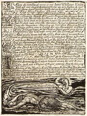 Relief etching was the same basic method used for woodcutting, and copper relief etching had been practised in the early eighteenth century by Elisha Kirkall, but Blake was the first to use such a method to create both words and designs mixed together on the same plate.[13] Apart from the unique aesthetic effects possible, a major advantage of relief etching was that Blake could print the material himself. Because the text was in relief, the pressure needed for printing was constant, unlike in intaglio printing, where different pressures were needed to force the paper into the furrows, depending on size. Additionally, intaglio etchings and engravings were printed with great pressure, but in relief etching, because the printed material was a raised surface rather than incised lines, considerably less pressure was required.[14] As such, relief etching tackled the problem of the division of labour of publishing. Blake's new method was autographic; "it permitted – indeed promoted – a seamless relationship between conception and execution rather than the usual divisions between invention and production embedded in eighteenth-century print technology, and its economic and social distinctions among authors, printers, artists and engravers. Like drawings and manuscripts, Blake's relief etchings were created by the direct and positive action of the author/artist's hand without intervening processes."[15] Blake served as artist, engraver, printer and publisher.
