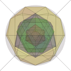 In this picture the vertices of the polyhedra represent the elements of the group, with the center of the sphere representing the identity element. Each vertex represents a rotation about the axis pointing from the center to that vertex, by an angle equal to the distance from the origin, in radians. Vertices in the same polyhedron are in the same conjugacy class. Since the conjugacy class equation for A5 is 1 + 12 + 12 + 15 + 20 = 60, we obtain four distinct (nontrivial) polyhedra.