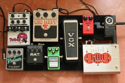When electronic transistors began to replace vacuum tubes, it became possible to fit aural effects circuits into a portable device. These first effects pedals —or "stompboxes", so called because a guitarist would stomp on one to activate it—were manufactured in the early 1960s and became popular through groups like The Kinks and The Rolling Stones by the middle of the decade.[7][8] Early pedals mainly created a distortion or "fuzz-tone" effect, but with the arise of psychedelic rock, more esoteric effects became popular. Warwick Electronics manufactured the first wah-wah pedal in 1967 and that same year Roger Mayer issued the first octave effect.[9][10][11]