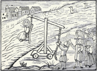 Use This was a form of punishment that was mainly reserved for supposed witches. The victim was tied to a chair which was elevated by ropes above a pond or Barrel/vat of water. The victim was then lowered into the water until completely Underwater|submerged. The chair was raised if the victim was about to pass out or to give the victim a chance to Confession (law)|confess. Often, some form of a plug, or more simply, a piece of fruit, was placed in the victim's mouth and nose beforehand, so they couldn't get a good breath before being dunked. If the victim confessed they would most likely be killed. This method was widely used during the Spanish Inquisition and in England and France. The victim was usually intermittently submerged for many hours until he or she revealed information or death had occurred. Ordeal by water began with the witch-hunts of the 16th and 17th centuries. King James VI of Scotland (later also James I of England) claimed in his Daemonologie that water was so pure an element that it repelled the guilty.