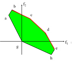 In Figure 1, the extreme points "e" and "b" maximize the first and second objectives, respectively. The red boundary between those two extreme points represents the efficient set. It can be seen from the figure that, for any feasible solution outside the efficient set, it is possible to improve both objectives by some points on the efficient set. Conversely, for any point on the efficient set, it is not possible to improve both objectives by moving to any other feasible solution. At these solutions, one has to sacrifice from one of the objectives in order to improve the other objective.