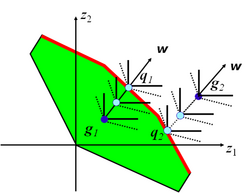 The achievement scalarizing function can be used to project any point (feasible or infeasible) on the efficient frontier. Any point (supported or not) can be reached. The second term in the objective function is required to avoid generating inefficient solutions. Figure 3 demonstrates how a feasible point, g1, and an infeasible point, g2, are projected onto the nondominated points, q1 and q2, respectively, along the direction w using an achievement scalarizing function. The dashed and solid contours correspond to the objective function contours with and without the second term of the objective function, respectively.